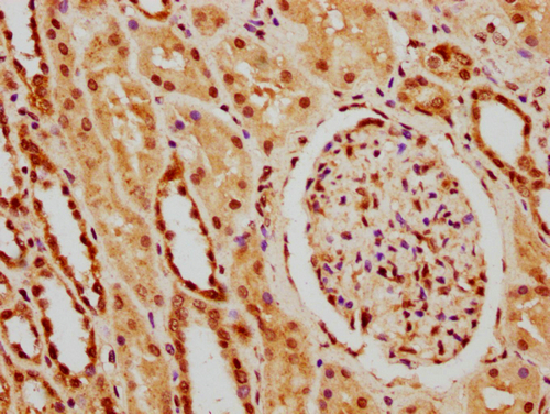 IHC image of CSB-PA010418PA41nphHU diluted at 1:20 and staining in paraffin-embedded human kidney tissue performed on a Leica BondTM system. After dewaxing and hydration, antigen retrieval was mediated by high pressure in a citrate buffer (pH 6.0). Section was blocked with 10% normal goat serum 30min at RT. Then primary antibody (1% BSA) was incubated at 4°C overnight. The primary is detected by a biotinylated secondary antibody and visualized using an HRP conjugated SP system.