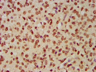 IHC image of CSB-PA010429OA12nbioHU diluted at 1:1 and staining in paraffin-embedded human glioma performed on a Leica BondTM system. After dewaxing and hydration, antigen retrieval was mediated by high pressure in a citrate buffer (pH 6.0). Section was blocked with 10% normal goat serum 30min at RT. Then primary antibody (1% BSA) was incubated at 4°C overnight. The primary is detected by a biotinylated secondary antibody and visualized using an HRP conjugated SP system.