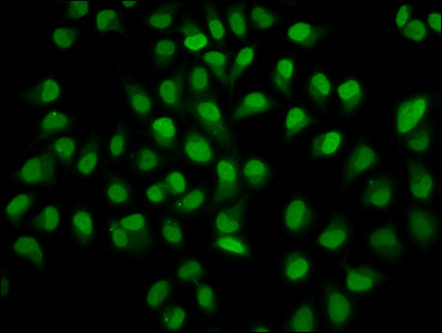 Immunofluorescence staining of Hela cells with CSB-PA010429OA12nhibHU at 1:10, counter-stained with DAPI. The cells were fixed in 4% formaldehyde, permeabilized using 0.2% Triton X-100 and blocked in 10% normal Goat Serum. The cells were then incubated with the antibody overnight at 4°C. The secondary antibody was Alexa Fluor 488-congugated AffiniPure Goat Anti-Rabbit IgG(H+L).