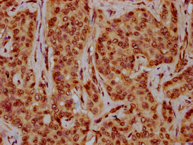 IHC image of CSB-PA010429OA44nhibHU diluted at 1:10 and staining in paraffin-embedded human liver cancer performed on a Leica BondTM system. After dewaxing and hydration, antigen retrieval was mediated by high pressure in a citrate buffer (pH 6.0). Section was blocked with 10% normal goat serum 30min at RT. Then primary antibody (1% BSA) was incubated at 4°C overnight. The primary is detected by a biotinylated secondary antibody and visualized using an HRP conjugated SP system.