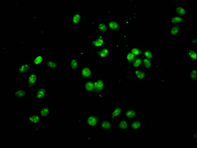 Immunofluorescence staining of Hela cells with CSB-PA010429OA77nme1HU at 1:2.5, counter-stained with DAPI. The cells were fixed in 4% formaldehyde, permeabilized using 0.2% Triton X-100 and blocked in 10% normal Goat Serum. The cells were then incubated with the antibody overnight at 4°C. The secondary antibody was Alexa Fluor 488-congugated AffiniPure Goat Anti-Rabbit IgG(H+L).