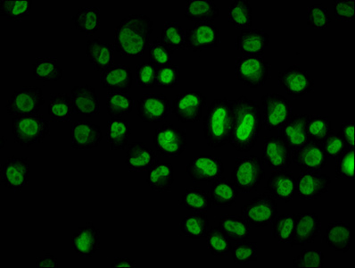 Immunofluorescence staining of Hela cells with CSB-PA010429OA79npropHU at 1:10, counter-stained with DAPI. The cells were fixed in 4% formaldehyde, permeabilized using 0.2% Triton X-100 and blocked in 10% normal Goat Serum. The cells were then incubated with the antibody overnight at 4°C. The secondary antibody was Alexa Fluor 488-congugated AffiniPure Goat Anti-Rabbit IgG(H+L).