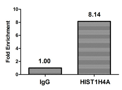 Chromatin Immunoprecipitation Hela (4*106) were treated with Micrococcal Nuclease, sonicated, and immunoprecipitated with 5µg anti-HIST1H4A (CSB-PA010429OA16nbutHU) or a control normal rabbit IgG. The resulting ChIP DNA was quantified using real-time PCR with primers against the β-Globin promoter.