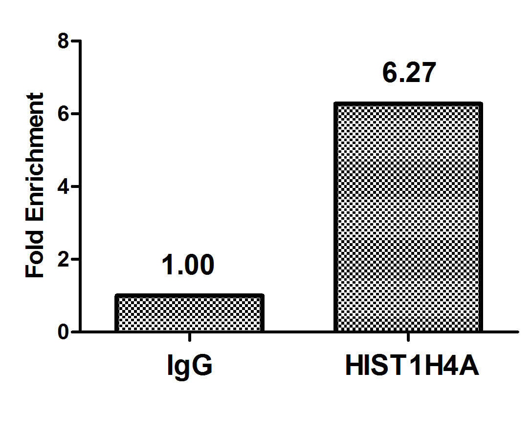 Chromatin Immunoprecipitation Hela (4*106) were treated with Micrococcal Nuclease, sonicated, and immunoprecipitated with 5µg anti-HIST1H4A (CSB-PA010429OA05ncrHU) or a control normal rabbit IgG. The resulting ChIP DNA was quantified using real-time PCR with primers against the β-Globin promoter.