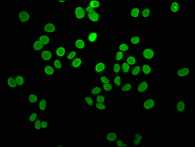 Immunofluorescence staining of Hela cells with CSB-PA010429OA05ncrHU at 1:5, counter-stained with DAPI. The cells were fixed in 4% formaldehyde, permeabilized using 0.2% Triton X-100 and blocked in 10% normal Goat Serum. The cells were then incubated with the antibody overnight at 4°C. The secondary antibody was Alexa Fluor 488-congugated AffiniPure Goat Anti-Rabbit IgG(H+L).