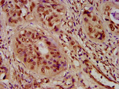 IHC image of CSB-PA010429OA05ncrHU diluted at 1:100 and staining in paraffin-embedded human cervical cancer performed on a Leica BondTM system. After dewaxing and hydration, antigen retrieval was mediated by high pressure in a citrate buffer (pH 6.0). Section was blocked with 10% normal goat serum 30min at RT. Then primary antibody (1% BSA) was incubated at 4°C overnight. The primary is detected by a biotinylated secondary antibody and visualized using an HRP conjugated SP system.