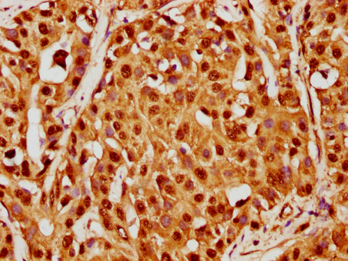 IHC image of CSB-PA010429PA77nacHU diluted at 1:20 and staining in paraffin-embedded human liver cancer performed on a Leica BondTM system. After dewaxing and hydration, antigen retrieval was mediated by high pressure in a citrate buffer (pH 6.0). Section was blocked with 10% normal goat serum 30min at RT. Then primary antibody (1% BSA) was incubated at 4°C overnight. The primary is detected by a biotinylated secondary antibody and visualized using an HRP conjugated SP system.
