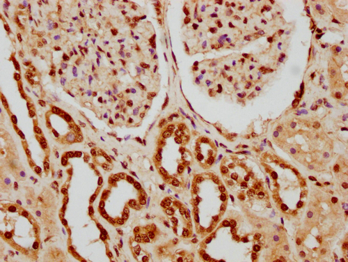 IHC image of CSB-PA010429PA79nforHU diluted at 1:20 and staining in paraffin-embedded human kidney tissue performed on a Leica BondTM system. After dewaxing and hydration, antigen retrieval was mediated by high pressure in a citrate buffer (pH 6.0). Section was blocked with 10% normal goat serum 30min at RT. Then primary antibody (1% BSA) was incubated at 4°C overnight. The primary is detected by a biotinylated secondary antibody and visualized using an HRP conjugated SP system.