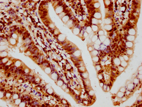 IHC image of CSB-PA010429PA88nohHU diluted at 1:8 and staining in paraffin-embedded human small intestine tissue performed on a Leica BondTM system. After dewaxing and hydration, antigen retrieval was mediated by high pressure in a citrate buffer (pH 6.0). Section was blocked with 10% normal goat serum 30min at RT. Then primary antibody (1% BSA) was incubated at 4°C overnight. The primary is detected by a biotinylated secondary antibody and visualized using an HRP conjugated SP system.