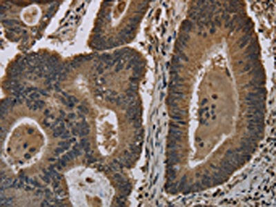 The image on the left is immunohistochemistry of paraffin-embedded Human colon cancer tissue using CSB-PA951904(HIST4H4 Antibody) at dilution 1/20, on the right is treated with fusion protein. (Original magnification: ×200)