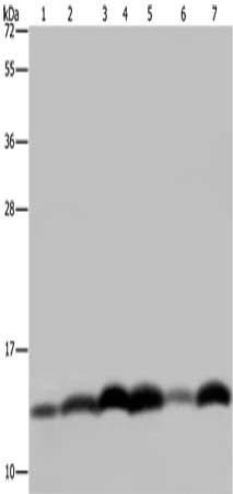 Gel: 10%SDS-PAGE, Lysate: 40 μg, Lane 1-6: LoVo cells, NIH/3T3 cells, 293T cells, mouse thymus tissue, Hela cells, mouse pancreas tissue, Primary antibody: CSB-PA951904(HIST4H4 Antibody) at dilution 1/250, Secondary antibody: Goat anti rabbit IgG at 1/8000 dilution, Exposure time: 10 seconds