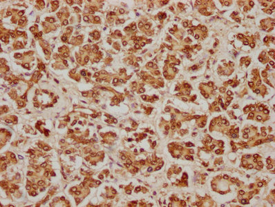 IHC image of CSB-PA620981LA01HU diluted at 1:100 and staining in paraffin-embedded human pancreatic tissue performed on a Leica BondTM system. After dewaxing and hydration, antigen retrieval was mediated by high pressure in a citrate buffer (pH 6.0). Section was blocked with 10% normal goat serum 30min at RT. Then primary antibody (1% BSA) was incubated at 4°C overnight. The primary is detected by a biotinylated secondary antibody and visualized using an HRP conjugated SP system.