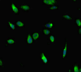 Immunofluorescent analysis of Hela cells using CSB-PA744479HA01HU at dilution of 1: 100 and Alexa Fluor 488-congugated AffiniPure Goat Anti-Rabbit IgG(H+L)