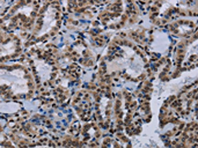 The image on the left is immunohistochemistry of paraffin-embedded Human thyroid cancer tissue using CSB-PA225274(HMGB1 Antibody) at dilution 1/30, on the right is treated with synthetic peptide. (Original magnification: ×200)