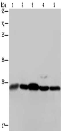 Gel: 10%SDS-PAGE, Lysate: 40 μg, Lane 1-5: Human hepatocellular carcinoma tissue, Hela cells, Jurkat cells, 293T cells, human breast infiltrative duct tissue, Primary antibody: CSB-PA225274(HMGB1 Antibody) at dilution 1/200, Secondary antibody: Goat anti rabbit IgG at 1/8000 dilution, Exposure time: 1 minute