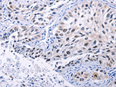The image on the left is immunohistochemistry of paraffin-embedded Human lung cancer tissue using CSB-PA121578(HMGB3 Antibody) at dilution 1/20, on the right is treated with synthetic peptide. (Original magnification: ×200)