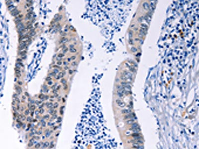 The image on the left is immunohistochemistry of paraffin-embedded Human colon cancer tissue using CSB-PA121578(HMGB3 Antibody) at dilution 1/20, on the right is treated with synthetic peptide. (Original magnification: ×200)
