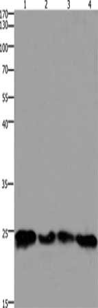 Gel: 10%SDS-PAGE, Lysate: 30 μg, Lane 1-4: 293T cells, hela cells, mouse lung tissue, Mouse brain tissue, Primary antibody: CSB-PA121578(HMGB3 Antibody) at dilution 1/400, Secondary antibody: Goat anti rabbit IgG at 1/8000 dilution, Exposure time: 1.5 minutes