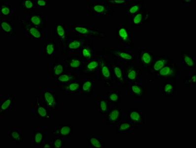 Immunofluorescence staining of Hela cells with CSB-PA010600HA01HU at 1:100, counter-stained with DAPI. The cells were fixed in 4% formaldehyde, permeabilized using 0.2% Triton X-100 and blocked in 10% normal Goat Serum. The cells were then incubated with the antibody overnight at 4°C. The secondary antibody was Alexa Fluor 488-congugated AffiniPure Goat Anti-Rabbit IgG(H+L).
