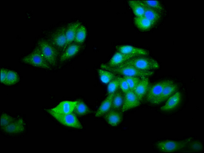 Immunofluorescence staining of HepG2 cells with CSB-PA771464LA01HU at 1:100, counter-stained with DAPI. The cells were fixed in 4% formaldehyde, permeabilized using 0.2% Triton X-100 and blocked in 10% normal Goat Serum. The cells were then incubated with the antibody overnight at 4°C. The secondary antibody was Alexa Fluor 488-congugated AffiniPure Goat Anti-Rabbit IgG(H+L).