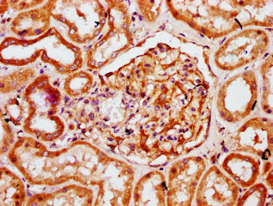 IHC image of CSB-PA771464LA01HU diluted at 1:300 and staining in paraffin-embedded human kidney tissue performed on a Leica BondTM system. After dewaxing and hydration, antigen retrieval was mediated by high pressure in a citrate buffer (pH 6.0). Section was blocked with 10% normal goat serum 30min at RT. Then primary antibody (1% BSA) was incubated at 4°C overnight. The primary is detected by a biotinylated secondary antibody and visualized using an HRP conjugated SP system.