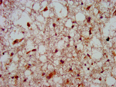 IHC image of CSB-PA010654LA01HU diluted at 1:800 and staining in paraffin-embedded human brain tissue performed on a Leica BondTM system. After dewaxing and hydration, antigen retrieval was mediated by high pressure in a citrate buffer (pH 6.0). Section was blocked with 10% normal goat serum 30min at RT. Then primary antibody (1% BSA) was incubated at 4°C overnight. The primary is detected by a biotinylated secondary antibody and visualized using an HRP conjugated SP system.