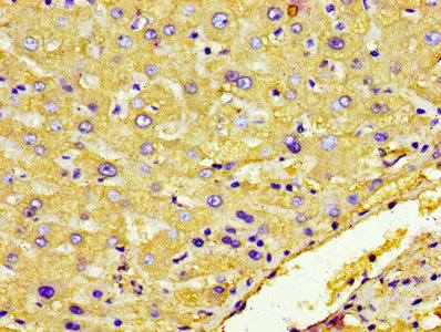 IHC image of CSB-PA14609A0Rb diluted at 1:600 and staining in paraffin-embedded human liver tissue performed on a Leica BondTM system. After dewaxing and hydration, antigen retrieval was mediated by high pressure in a citrate buffer (pH 6.0). Section was blocked with 10% normal goat serum 30min at RT. Then primary antibody (1% BSA) was incubated at 4°C overnight. The primary is detected by a biotinylated secondary antibody and visualized using an HRP conjugated ABC system.