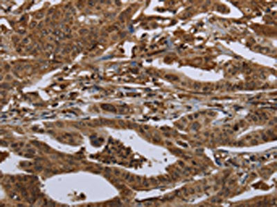 The image on the left is immunohistochemistry of paraffin-embedded Human colon cancer tissue using CSB-PA994843(HPGD Antibody) at dilution 1/30, on the right is treated with fusion protein. (Original magnification: ×200)