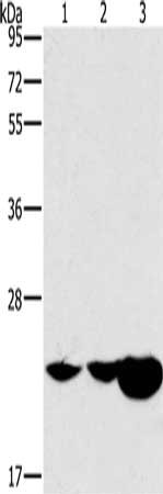 Gel: 10%SDS-PAGE, Lysate: 40 μg, Lane 1-3: Mouse kidney tissue, Mouse liver tissue, human fetal liver tissue, Primary antibody: CSB-PA159201(HRASLS2 Antibody) at dilution 1/362.5, Secondary antibody: Goat anti rabbit IgG at 1/8000 dilution, Exposure time: 40 seconds