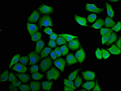 Immunofluorescence staining of Hela cells with CSB-PA010766LA01HU at 1:33, counter-stained with DAPI. The cells were fixed in 4% formaldehyde, permeabilized using 0.2% Triton X-100 and blocked in 10% normal Goat Serum. The cells were then incubated with the antibody overnight at 4°C. The secondary antibody was Alexa Fluor 488-congugated AffiniPure Goat Anti-Rabbit IgG(H+L).