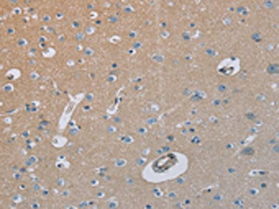 The image on the left is immunohistochemistry of paraffin-embedded Human brain tissue using CSB-PA972922(HSD3B7 Antibody) at dilution 1/40, on the right is treated with fusion protein. (Original magnification: ×200)