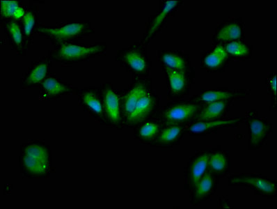 Immunofluorescence staining of Hela cells with CSB-PA10887A0Rb at 1:133, counter-stained with DAPI. The cells were fixed in 4% formaldehyde, permeabilized using 0.2% Triton X-100 and blocked in 10% normal Goat Serum. The cells were then incubated with the antibody overnight at 4°C. The secondary antibody was Alexa Fluor 488-congugated AffiniPure Goat Anti-Rabbit IgG(H+L).