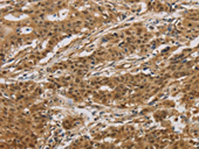 The image on the left is immunohistochemistry of paraffin-embedded Human gastric cancer tissue using CSB-PA084737(HSPA4 Antibody) at dilution 1/20, on the right is treated with fusion protein. (Original magnification: ×200)
