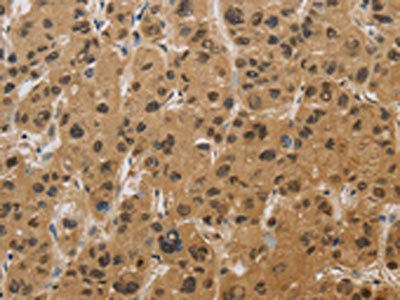 The image on the left is immunohistochemistry of paraffin-embedded Human liver cancer tissue using CSB-PA084737(HSPA4 Antibody) at dilution 1/20, on the right is treated with fusion protein. (Original magnification: ×200)