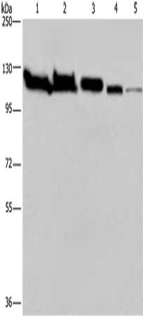 Gel: 6%SDS-PAGE, Lysate: 40 μg, Lane 1-5: Hela cells, Raji cells, NIH/3T3 cells, A375 cells, 293T cells, Primary antibody: CSB-PA084737(HSPA4 Antibody) at dilution 1/200, Secondary antibody: Goat anti rabbit IgG at 1/8000 dilution, Exposure time: 2 minutes