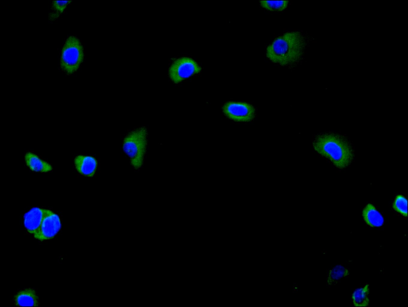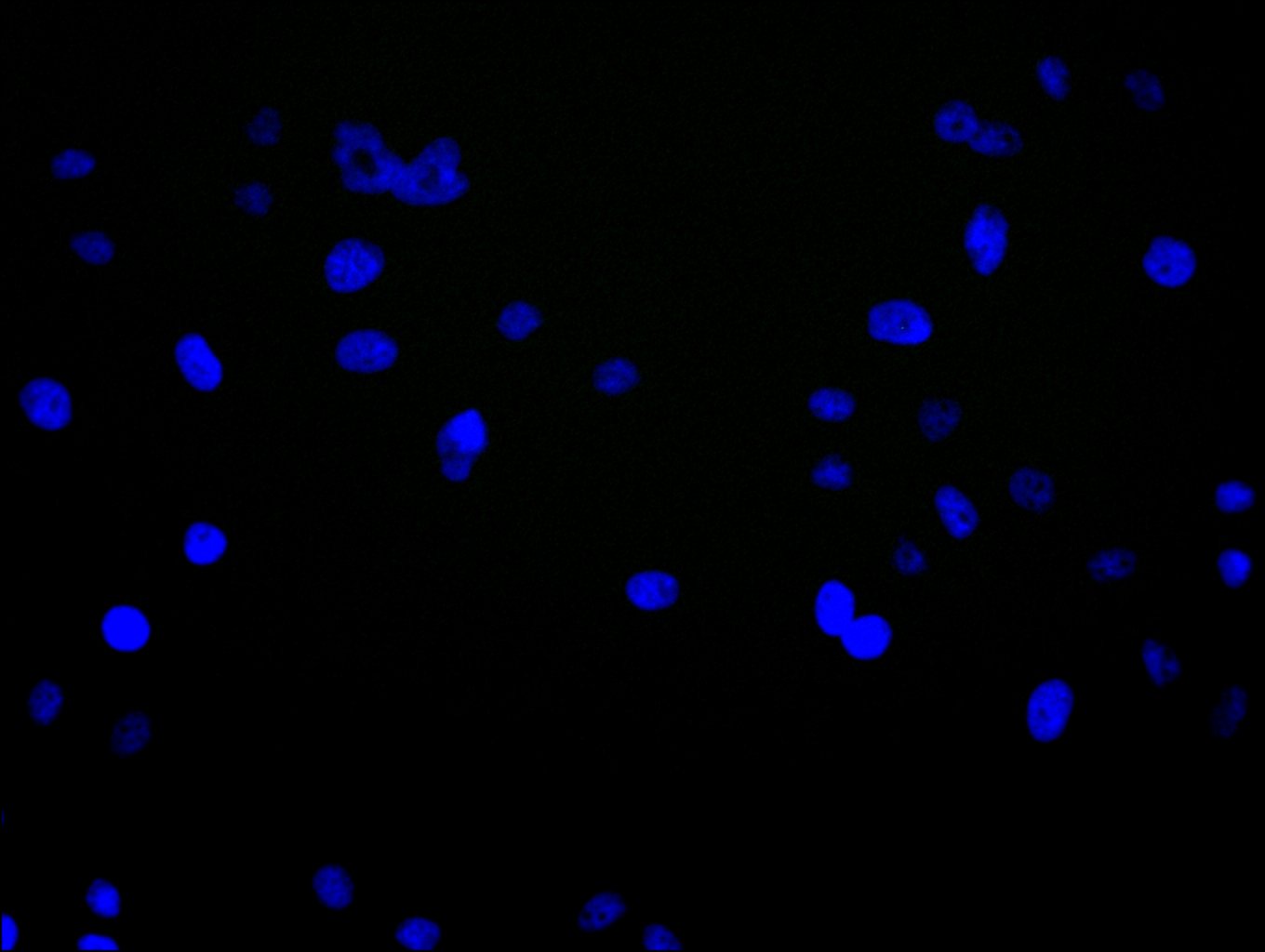Immunofluorescence staining of Hela cell with CSB-PA010885LA01HU at 1:30, counter-stained with DAPI. The cells were fixed in 4% formaldehyde and blocked in 10% normal Goat Serum. The cells were then incubated with the antibody overnight at 4C. The secondary antibody was Alexa Fluor 488-congugated AffiniPure Goat Anti-Rabbit IgG(H+L).