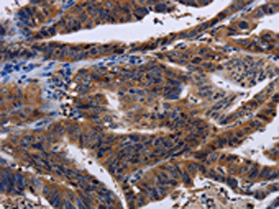 The image on the left is immunohistochemistry of paraffin-embedded Human gastic cancer tissue using CSB-PA246438(HTR2B Antibody) at dilution 1/60, on the right is treated with fusion protein. (Original magnification: ×200)