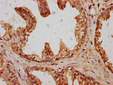 IHC image of CSB-PA719395LA01HU diluted at 1:400 and staining in paraffin-embedded human prostate cancer performed on a Leica BondTM system. After dewaxing and hydration, antigen retrieval was mediated by high pressure in a citrate buffer (pH 6.0). Section was blocked with 10% normal goat serum 30min at RT. Then primary antibody (1% BSA) was incubated at 4°C overnight. The primary is detected by a biotinylated secondary antibody and visualized using an HRP conjugated SP system.