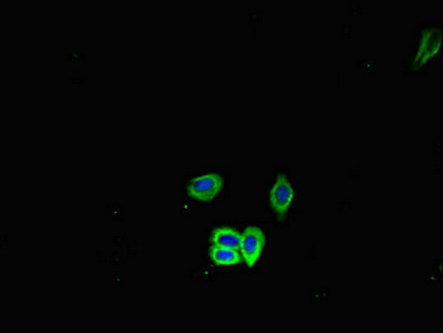 Immunofluorescent analysis of HepG2 cells using CSB-PA010827YA01MO at dilution of 1:100 and Alexa Fluor 488-congugated AffiniPure Goat Anti-Rabbit IgG(H+L)