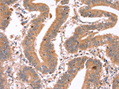 The image on the left is immunohistochemistry of paraffin-embedded Human colon cancer tissue using CSB-PA468797(ICAM5 Antibody) at dilution 1/20, on the right is treated with synthetic peptide. (Original magnification: ×200)