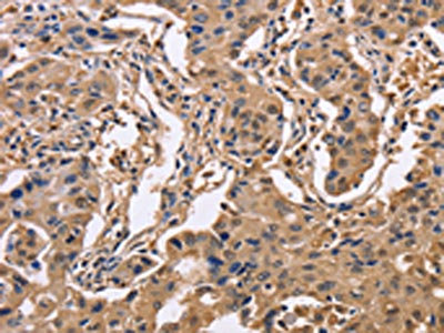 The image on the left is immunohistochemistry of paraffin-embedded Human lung cancer tissue using CSB-PA826954(IDH1 Antibody) at dilution 1/50, on the right is treated with fusion protein. (Original magnification: ×200)