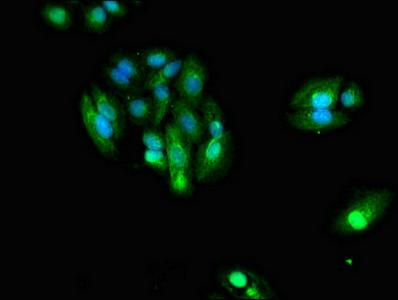 Immunofluorescent analysis of HepG2 cells using CSB-PA010989EA01HU at dilution of 1:100 and Alexa Fluor 488-congugated AffiniPure Goat Anti-Rabbit IgG(H+L)