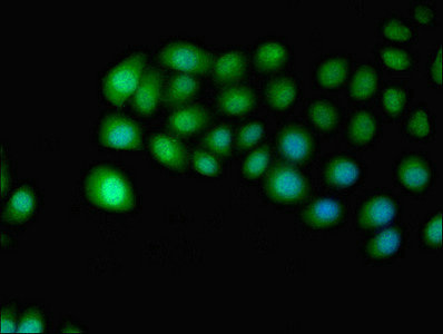 Immunofluorescent analysis of A549 cells using CSB-PA010997LA01HU at dilution of 1:100 and Alexa Fluor 488-congugated AffiniPure Goat Anti-Rabbit IgG(H+L)