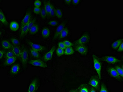 Immunofluorescent analysis of HepG2 cells using CSB-PA011025LA01HU at dilution of 1:100 and Alexa Fluor 488-congugated AffiniPure Goat Anti-Rabbit IgG(H+L)