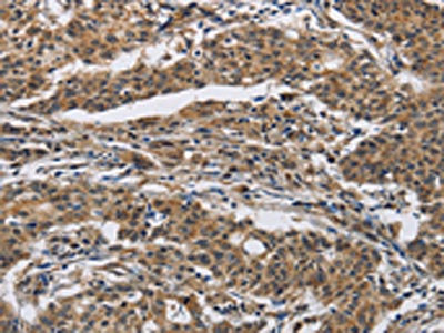 The image on the left is immunohistochemistry of paraffin-embedded Human gastric cancer tissue using CSB-PA149561(IFNGR2 Antibody) at dilution 1/40, on the right is treated with synthetic peptide. (Original magnification: ×200)