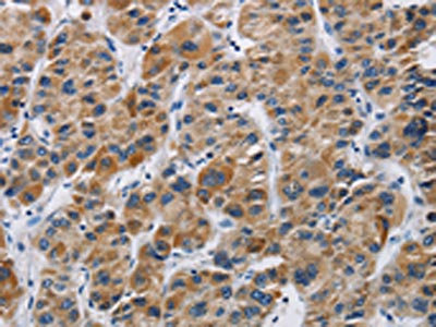 The image on the left is immunohistochemistry of paraffin-embedded Human liver cancer tissue using CSB-PA149561(IFNGR2 Antibody) at dilution 1/40, on the right is treated with synthetic peptide. (Original magnification: ×200)