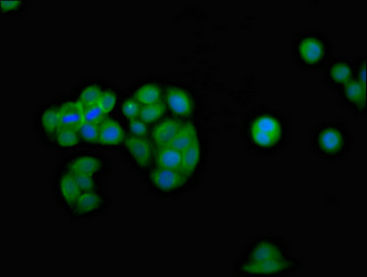 Immunofluorescence staining of PC-3 cells with CSB-PA011052LA01HU at 1:100, counter-stained with DAPI. The cells were fixed in 4% formaldehyde, permeabilized using 0.2% Triton X-100 and blocked in 10% normal Goat Serum. The cells were then incubated with the antibody overnight at 4°C. The secondary antibody was Alexa Fluor 488-congugated AffiniPure Goat Anti-Rabbit IgG(H+L).