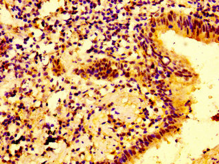 IHC image of CSB-PA011052LA01HU diluted at 1:100 and staining in paraffin-embedded human lung cancer performed on a Leica BondTM system. After dewaxing and hydration, antigen retrieval was mediated by high pressure in a citrate buffer (pH 6.0). Section was blocked with 10% normal goat serum 30min at RT. Then primary antibody (1% BSA) was incubated at 4°C overnight. The primary is detected by a biotinylated secondary antibody and visualized using an HRP conjugated SP system.