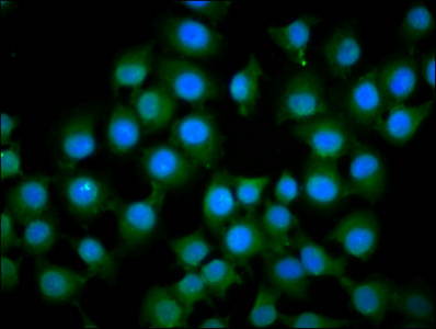 Immunofluorescence staining of A549 cells with CSB-PA887019LA01HU at 1:133, counter-stained with DAPI. The cells were fixed in 4% formaldehyde, permeabilized using 0.2% Triton X-100 and blocked in 10% normal Goat Serum. The cells were then incubated with the antibody overnight at 4°C. The secondary antibody was Alexa Fluor 488-congugated AffiniPure Goat Anti-Rabbit IgG(H+L).