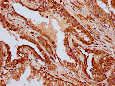 IHC image of CSB-PA887019LA01HU diluted at 1:400 and staining in paraffin-embedded human prostate cancer performed on a Leica BondTM system. After dewaxing and hydration, antigen retrieval was mediated by high pressure in a citrate buffer (pH 6.0). Section was blocked with 10% normal goat serum 30min at RT. Then primary antibody (1% BSA) was incubated at 4°C overnight. The primary is detected by a biotinylated secondary antibody and visualized using an HRP conjugated SP system.